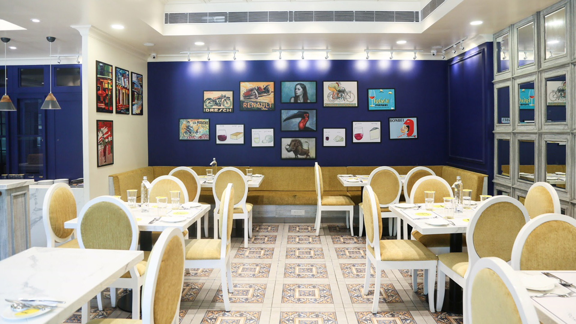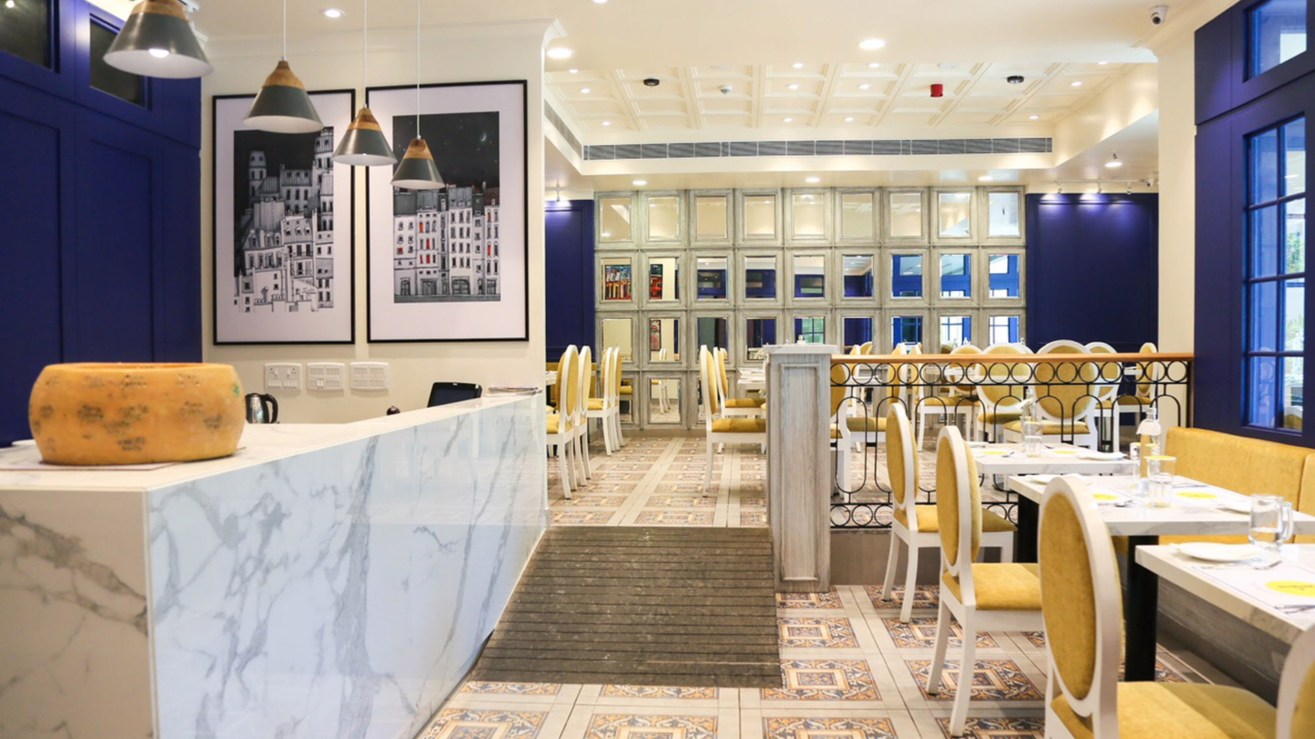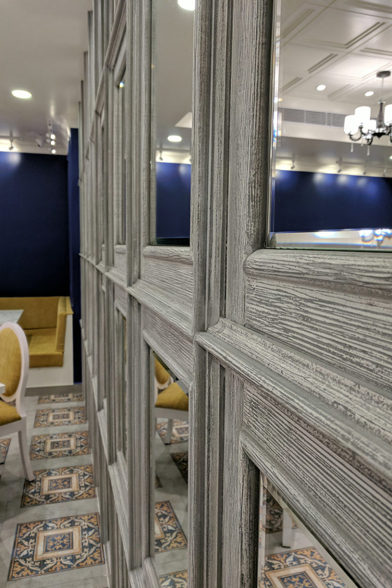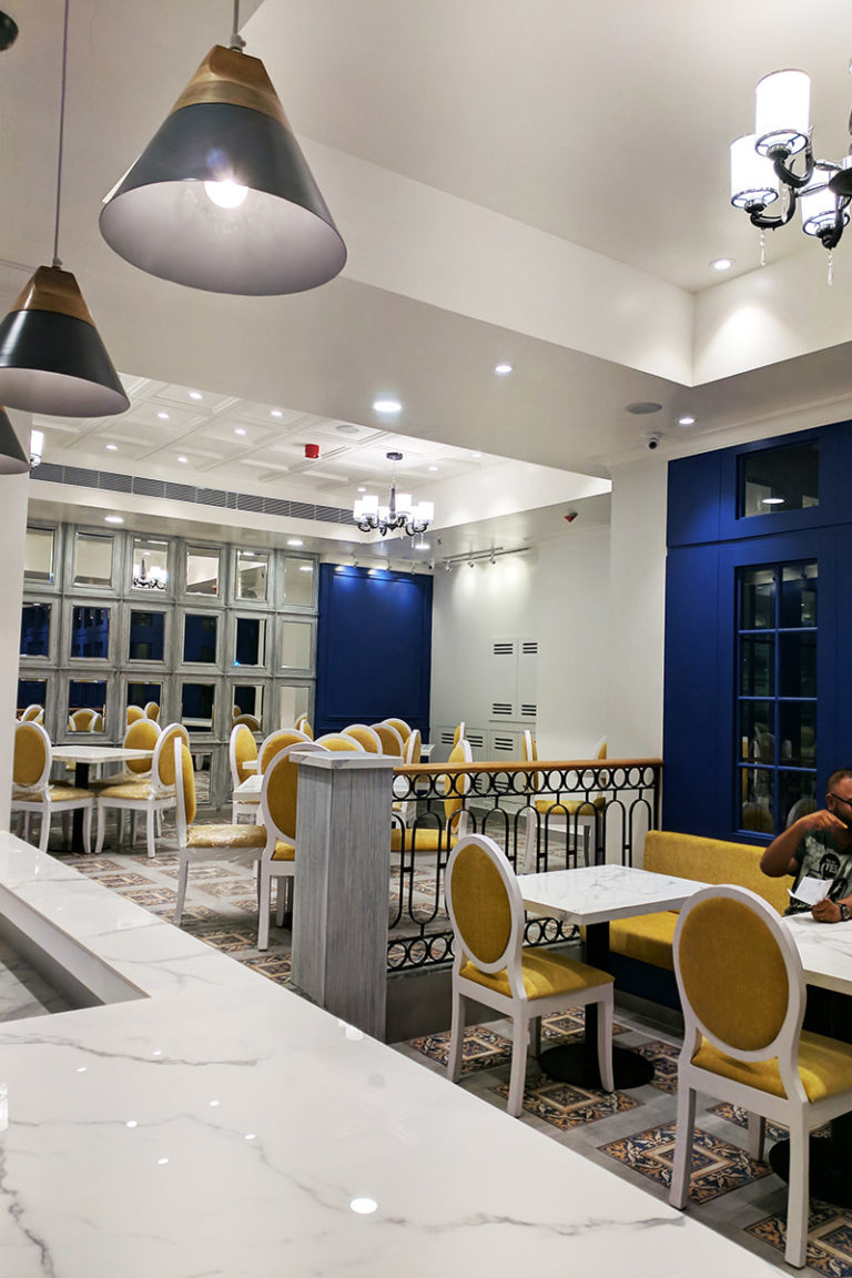 Over the canvas of classic blue, the café houses the neoclassical French elements that take the mainstage in the design. The mirrored wall in the seating area accentuates the volume of space while imbuing luxury into the design.Th white marble accents add to the vibrance of the blue canvas of the café. The design embarks on the journey fusion architecture, while catering to the local patrons. The design vocabulary of the design is unique and enticing.