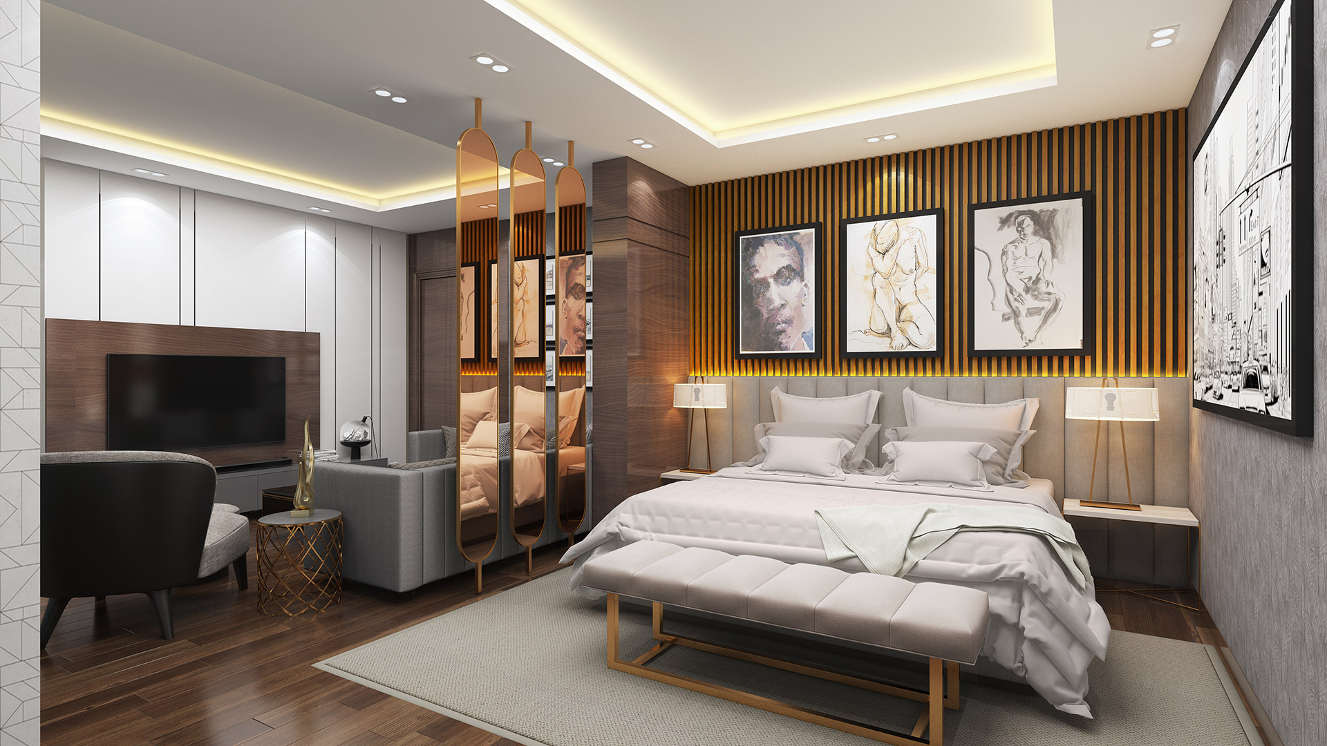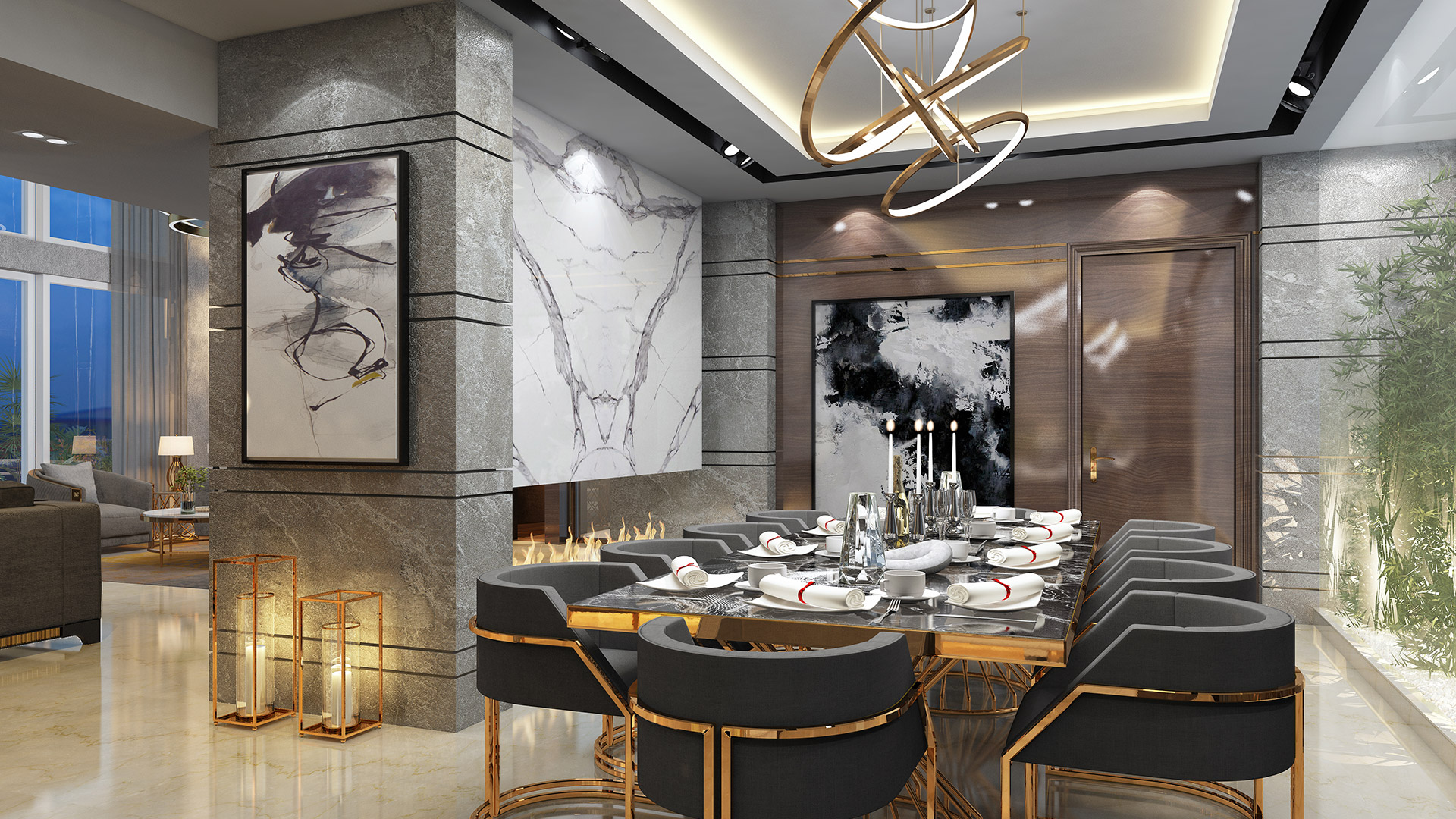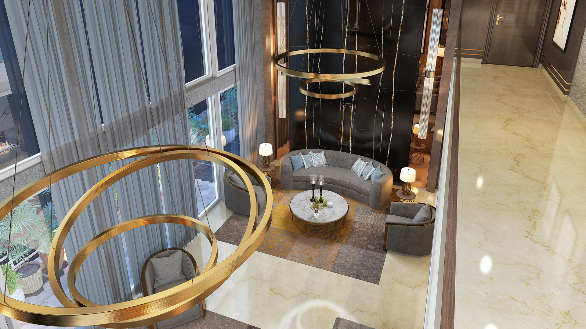 The design story of this apartment is based on amalgamation of subtle grey tones, bold accents of brass and parts of marble finish.